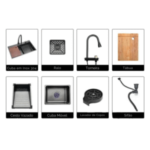 | Itens que acompanham | Torneira com Extensor, Cesto Vazado, Cuba móvel, Lavador de Copos, Tábua, Sifão e Ralo |